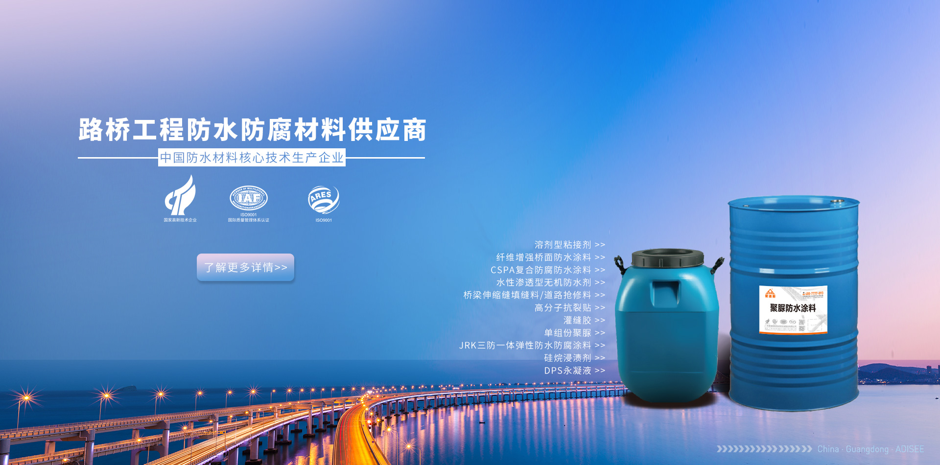 廣東愛(ài)迪斯新型材料科技有限公司廣州分公司 隔音隔熱系列 路橋及防腐防水系列 家裝工程防水系列 修繕補(bǔ)漏防水系列專(zhuān)業(yè)承接路橋防水防腐工程施工及防水材料銷(xiāo)售,路橋防水工程遍布全國(guó)各地,多年的技術(shù)經(jīng)驗(yàn)積累了一整套橋面防水病害處理方案,專(zhuān)業(yè)的路橋防水技術(shù),配套路橋防水施工設(shè)備,圓滿(mǎn)完成路橋防水施工任務(wù),用戶(hù)滿(mǎn)意度評(píng)價(jià)高,處橋梁防水行業(yè)技術(shù)領(lǐng)先水...